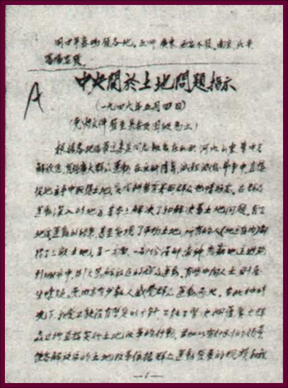 1946年中共中央发布的《五四指示》,决定改减租减息为没收地主土地、实现耕者有其田的政策,揭开了解放区土地立法的序幕