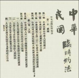 临时约法是辛亥革命胜利后以孙中山为首的中华民国临时政府 (南京)制定的具有"宪法"性质的根本大法,是中国历史上第一部真正具有资产阶级共和国宪法性质的法律文献。1912年3月11日取代中华民国临时政府组织大纲开始施行,于1914年5月1日因《中华民国约法》(袁世凯的法律)的公布而被取代,但为1916年6月29日大总统黎元洪所恢复。1917年9月10日以广东为基地建立的中华民国军政府展开护法运动,所护者即为中华民国临时约法