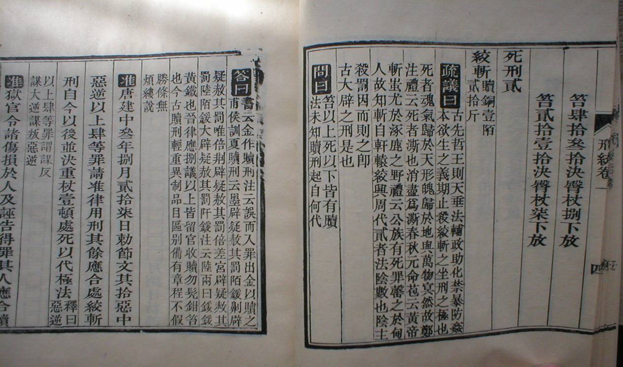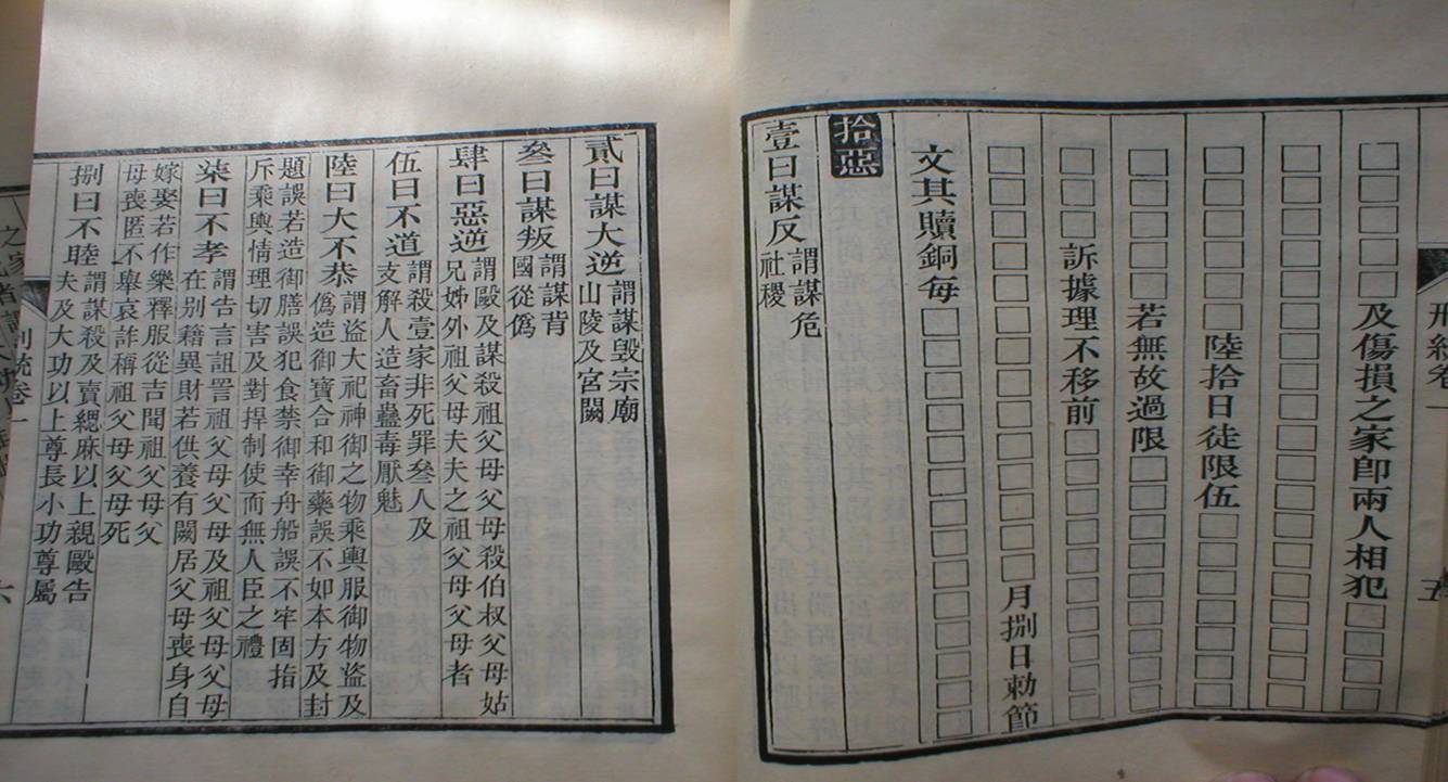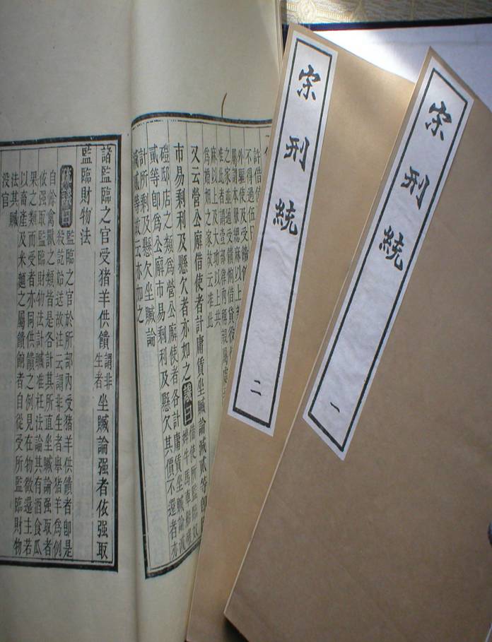 《宋刑统》正文  宋太祖建隆四年(963)颁行《宋刑统》,傅霖以其不变阅读和记忆,于是将全部律文的要旨,用韵文体裁撰为律学读本《刑统赋》,并自行作注,解说韵文含义。   《庆元条法事类》,书名,南宋谢深甫监修。全书共80卷,附录2卷。所收为南宋(1127起)初年至庆元(1195~1200)间□、令、格、式及随□申明。分职制、选举、文书、榷禁、财用、库务、赋役、农桑、道释、公吏、刑狱、当赎、服制、蛮夷、畜产、杂门等16门,为南宋法律、经济资料的汇编。  《大元通制》是在元世祖时期编纂的《至元新格》和元仁宗时期的《风宪宏纲》等一些法典的基础上编纂而成的,《大元通制》总共是二千五百三十九条,分成了三纲一目。三纲是诏制、条格和断例,一目是别类。在纲目下边又分出了很多的细目,这和唐宋时期的内容基本相似,具体的内容也继承了唐宋法律的思想。但在体制上没有唐宋法律那样统一的编纂形式,所以《大元通制》严格来说还不是一部法典,只是一部具有法典特性的法律集成。其中的“断例”相当与唐宋律中的“律”,“条格”则相当于“令”、“格”、“式”,“诏制”相当于“编敕”。  《元典章》是至治二年(1322)以前元朝法令文书的分类汇编,全名《大元圣政国朝典章》。在元成宗时期﹐曾规定各地官府抄集中统以来的律令格例,“置簿编写检举”,作为官史遵循的依据。《元典章》就是地方胥吏汇抄法令的一种坊刻本。全书所记史实,全是原始文牍,多为《元史》所不载,是研究元代政治、经济、风俗的难得的珍贵资料。 |