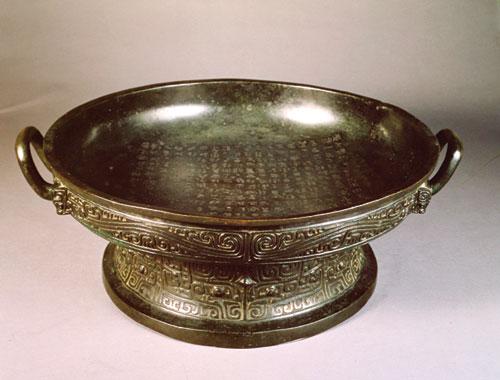 散氏盘又名“夨人盘”,是西周晚期青铜铸器。1976年扶风庄白村出土,现收藏于周原博物馆。原器通高20.16cm、腹深9.8cm、口径54.6cm。散氏盘的形制为浅腹、附耳、高圈足。盘外壁饰有深峻的回首卷尾夔龙,圈足上饕餮纹。铜质精粹,装饰古朴,并以其长篇铭文和精美的书法艺术著称于世,堪称中华青铜瑰宝。