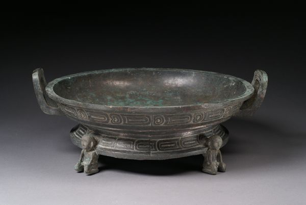 青铜盘出现于商周早期,至商代晚期逐渐流行。盛行于西周及春秋战国时期。青铜盘主要有圆形和方形两种,商代的青铜盘都是敞口、圈足、无耳,西周及春秋战国时期青铜盘的形制变化较大,一般都增设双耳,盘腹变浅,有的还有宽流和銴手,更有的在圈足上另外附足,以增加盘的高度。