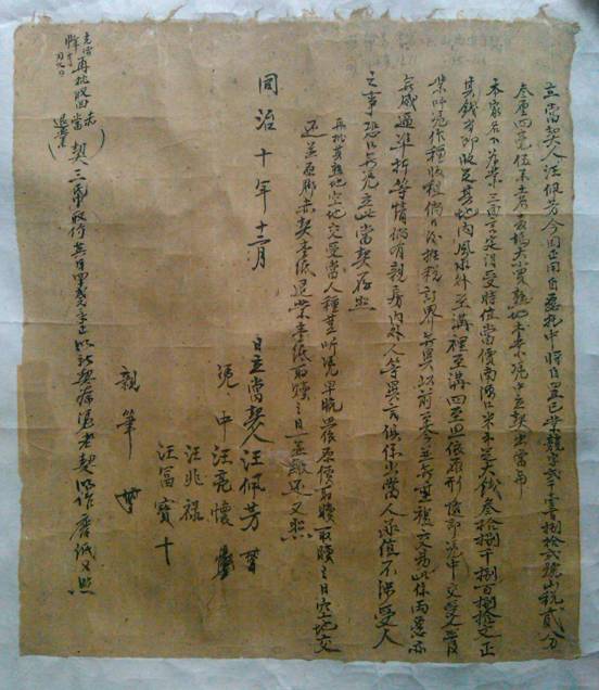本家各下为业,三面言定,得受时值当价南源江米市之大钱三十八千八百八十文整。现钱当即收之,其地内风水,外至沟里,四至田,依原型。随即交受八一及业,听凭做种收租,倘日一推税汀界无异从前。今并无重复交易,此系自愿,亦无威逼、准折等情况。尚有亲房内外人等言,俱保出当人之职,不渉受当人之事。恐口无凭,立此当契存照。
