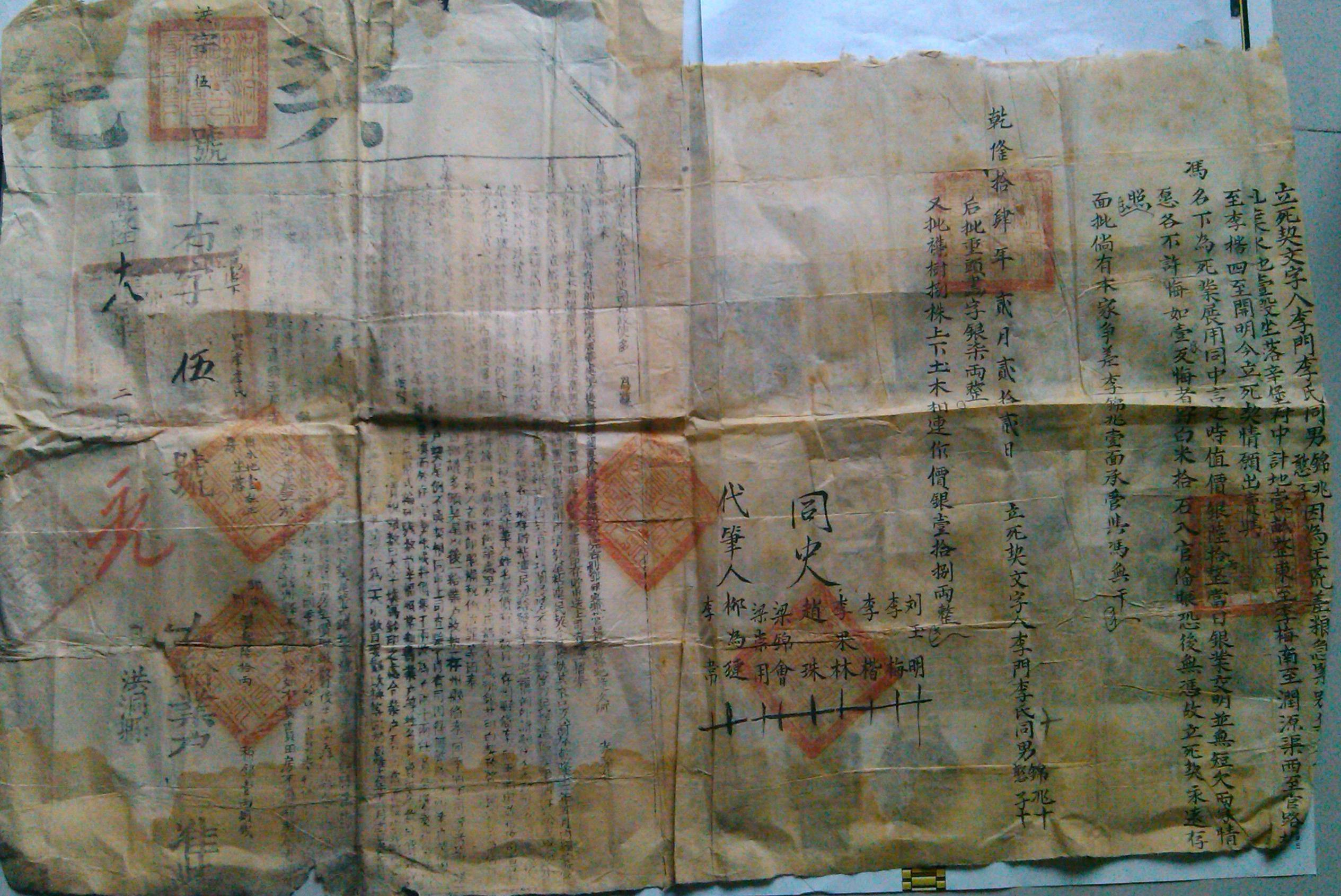 立死契文字人李门李氏同男锦兆、憨子,因为年荒差粮急,别无所兑,今将置倒的祖业水地一段,坐落于辛堡寸中,计地一亩整。东至李梅、南至润源渠、西至官路、北至李楷,四至开明。今立死契情愿出卖予冯名下为死业展用。同中言明时值价银六十两整,当日银业交明,并无短欠。两家情愿各不许悔,如一家反悔者,罚白米十石入官备惩。恐口无凭,故立死契存照。面批倘有本家争差李锦兆一面承管,与冯无关。